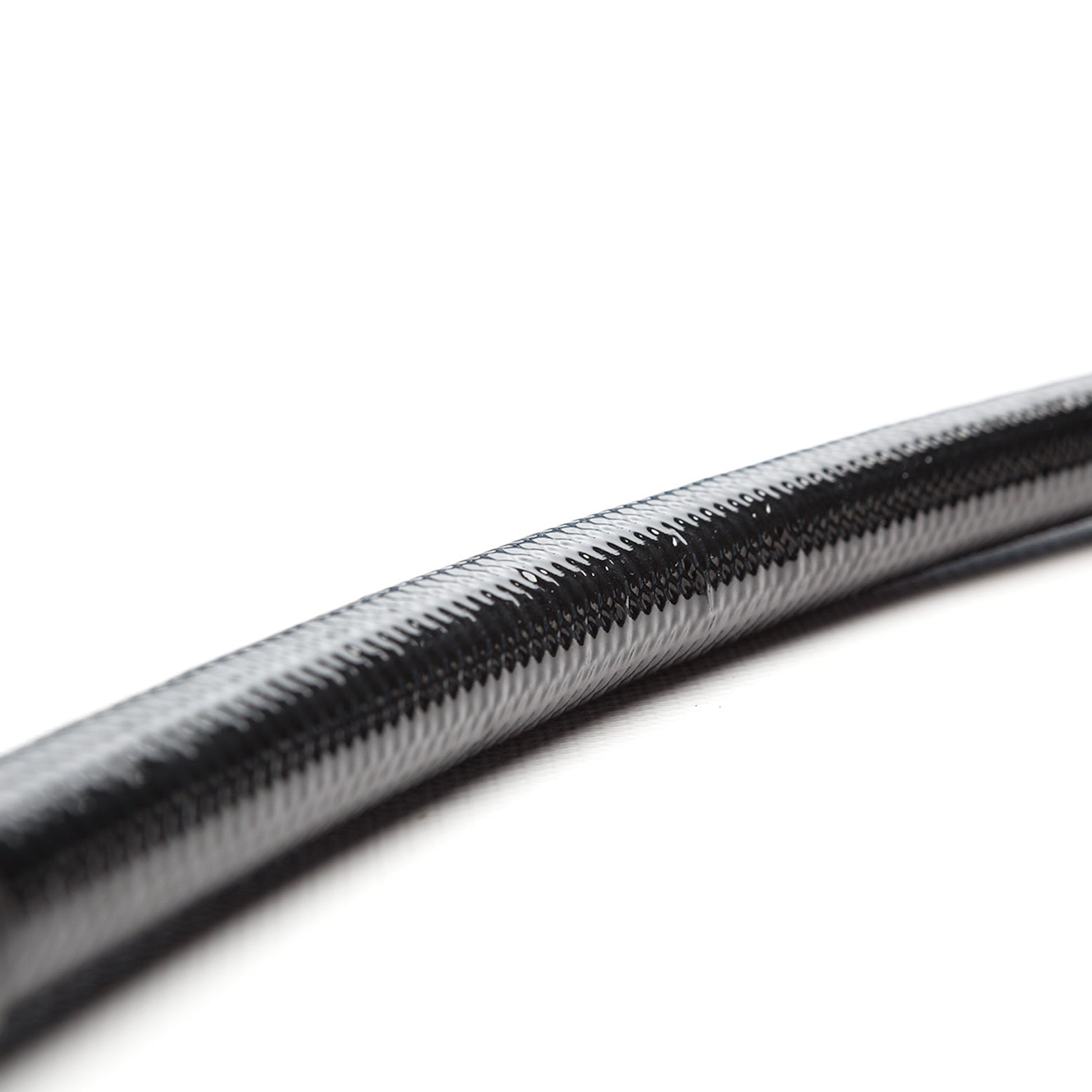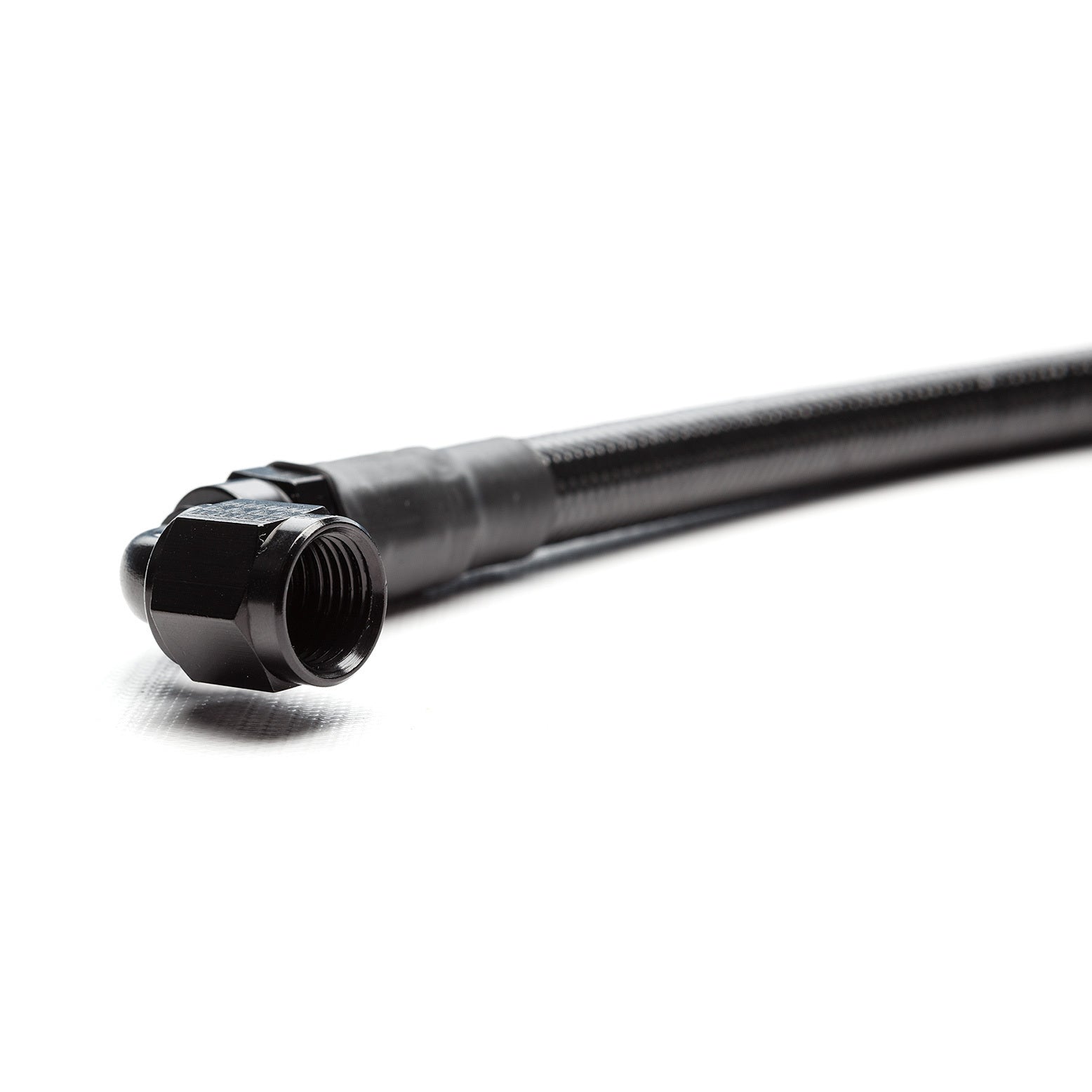A vehicle-specific mounting bracket secures the Ethanol Content Sensor. An SAE 30R9 E85-compatible hose with a right-angle 5/16" SAE quick disconnect fitting makes adapting to the OEM return line a snap. The high-pressure line between the sensor and OEM fuel rails uses -6AN crimp fittings and stainless-jacketed PTFE-lined hose for maximum durability and longevity.