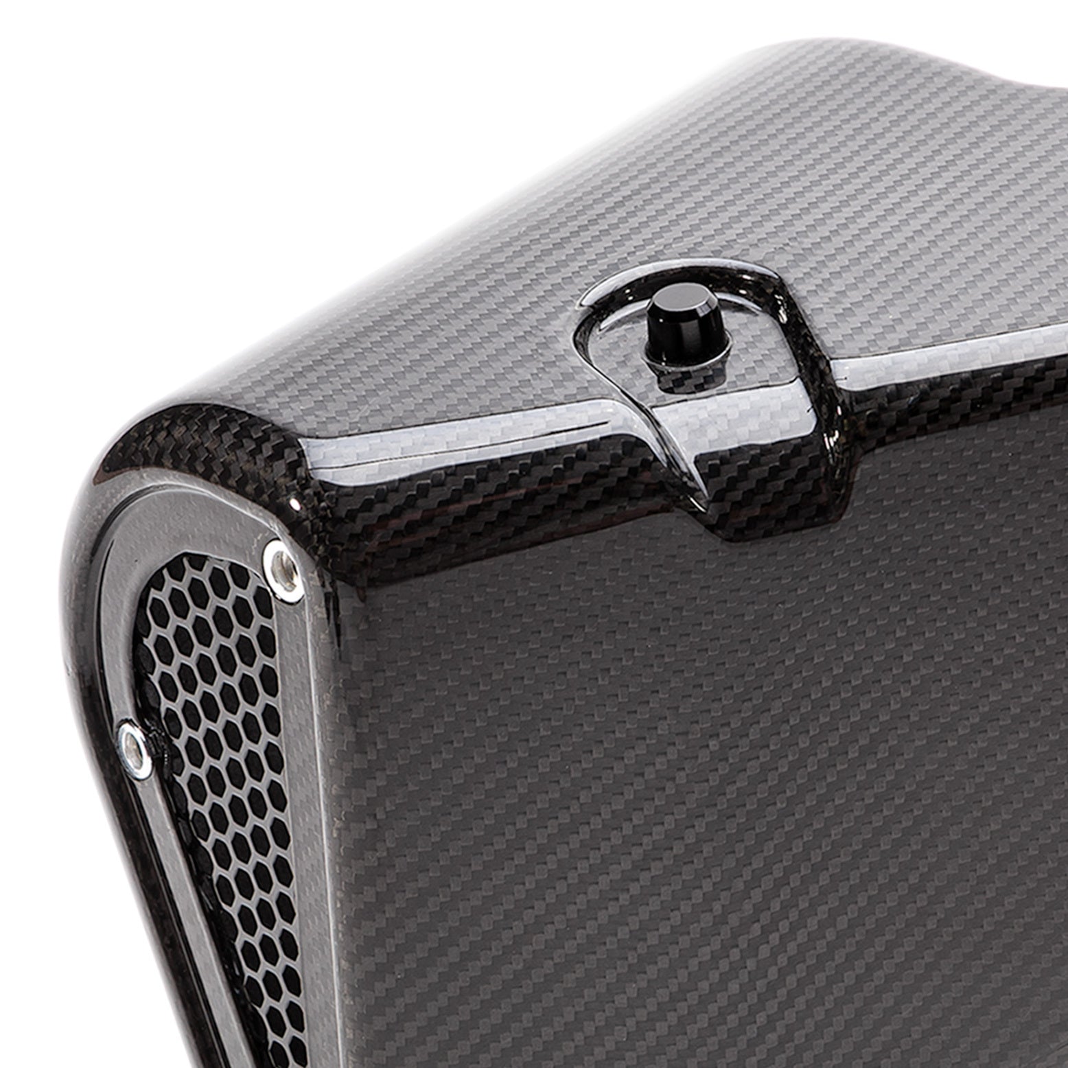 The main airbox is constructed of multiple layers of 2x2 twill carbon fiber sheets for a true carbon intake through and through. High quality gloss clear finish provides fade resistance from heat and UV light. A bespoke black Redline badge sits at the front of the integrated intake ducting. Air is filtered through a 35% larger (when compared to the standard SF Intake) pre-oiled filter and routed to the MAF housing which is bolted to the airbox by way of a black anodized billet aluminum adapter. The wire-reinforced black silicone coupler is sealed on either end with black anodized clamps for a very sleek install. A second billet plate can be removed from the fender side of the airbox to increase airflow and audible intake sounds of the system.