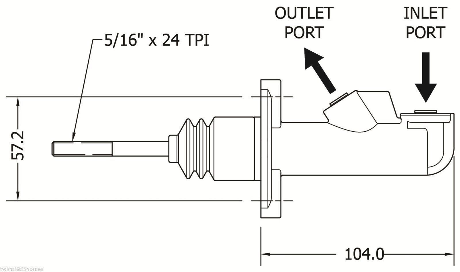 Has 1.375" stroke, Pushrod is 5/16" UNF thread, Fits PE Racing push rod extenders as supplied with Pedal Frame assemblies. Inlet ports are AN4 & outlet ports are AN3.