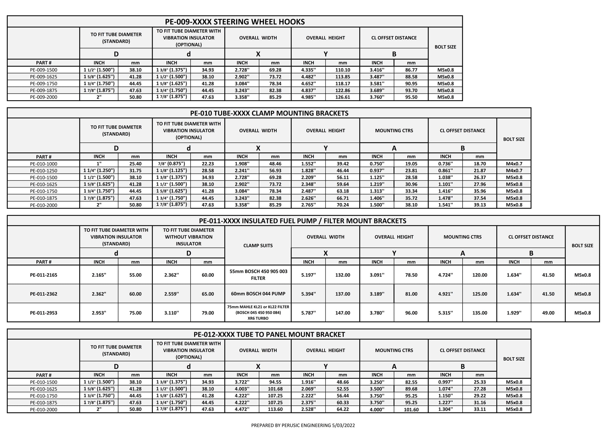 PE clamps come in four different styles and a variety of sizes to satisfy a wide range of tube mounting needs. Engineered to withstand a 10G dynamic load of 5 kg or a static load of 50 kg per clamp. The clamps have an optional vibration insulator that dampens vibration effects (NOTE: Adding the vibration insulator makes the clamp suit the next size down, except for the PE-11 range which is designed to always come with the vibration insulator). They are made of aircraft alloy with a hard anodised finish to resist the effects of harsh environments.