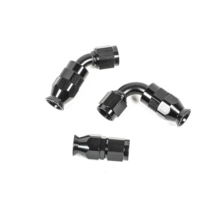 Each hose features a seamless extruded PTFRE core wrapped in a stainless steel wire braid and finished with a durable braided PET jacket. All hose ends are constructed from type-II black anodized aluminum for excellent corrosion resistance and a clean, professional finish.