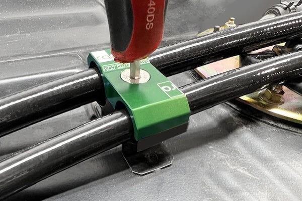 Two anodized aluminum clamps are provided to mount the PTFE fuel lines across the upper front portion of the fuel tank, as shown above.