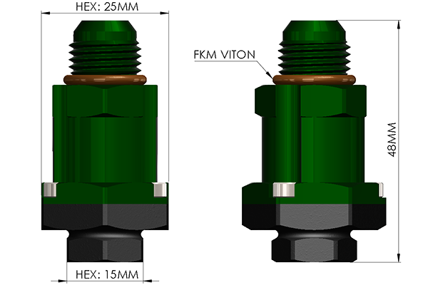 This 6AN male adapter is used to integrate a high flow check valve on the outlet of many fuel pumps. The valve out flows the integrated check valve that comes standard on many fuel pump outlets. Furthermore, decreasing this restriction allows the pump to operate at less current. This keeps fuel temperatures lower and prevents cavitation. The two billet aluminum adapter halves are secured together with a stainless steel retainer and bolts that clamp tightly around the pump outlet. A stainless steel plunger and spring are used for making a one-way connection. Viton O-rings seal for a leak free connection and E85 compatibility.
