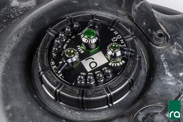 To simplifying aftermarket -AN hose plumbing, the 10AN ORB threaded feed port features a low profile 8AN male fitting and the 8AN ORB threaded return port features a low profile 6AN male fitting. To reconnect the OEM return and vent hoses, 8.5mm barb fittings are also included. Furthermore, no permanent modification to the OEM fuel tank access cover is required.