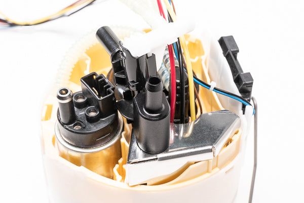 Several systems work together to move fuel into the collector basket and keep it full at all times. This ensures that the pumps have adequate fuel available, even during aggressive driving. The internal pumps are supplied with fuel from 3 different sources: the venturi jet pump fuel scavenged from the passive side of the tank, the returned fuel from the fuel pressure regulators (direct injection FPR and port injection FPR), and the one-way fill valve on the bottom of the OEM collector basket. This valve allow fuel in, but not out.