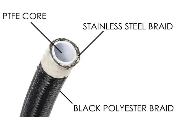 All Radium Engineering PTFE hoses have been successfully tested in-house to 1200psi although PTFE can typically withstand 2500psi+. They are also for extreme temperatures (-94F to +480F). They feature an extruded PTFE (fluoropolymer) core wrapped in a stainless steel wire braided sleeve. The outer coating is determined by the assembly process: Universal DIY ends (braided PET) or preassembled crimped ends (smooth PVC). All hose ends are type-II black anodized aluminum.