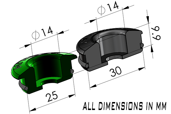 All 30mm injector seats are black anodized. All 25mm injector seats are Radium green anodized. The injector seats are CNC machined with a common 14mm bore for the lower injector O-ring.