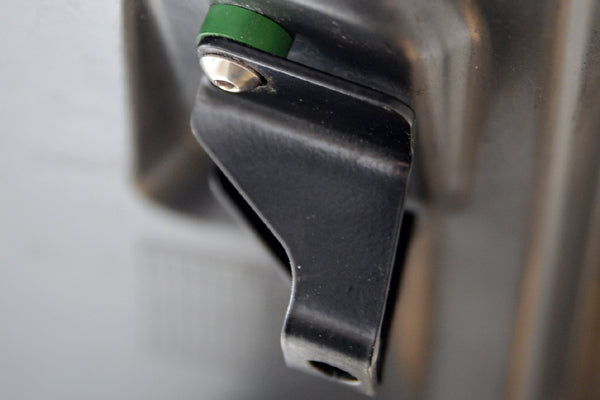 The billet spacers are all anodized black. They take place of the steel roll of body shim washers. The body shim spacers are anodized green. The billet aluminum clam hinge braces are available in three finishes: Titanium Silver Nickel-Plated, Bright Dip Black Anodized, and Radium Green Anodized.