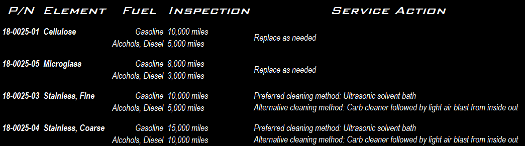 All replacement elements for the Radium fuel filter use anodized aluminum end caps that are laser engraved for easy identification and use an internal Viton O-ring for compatibility with all fuel types. See the element selection guide above.