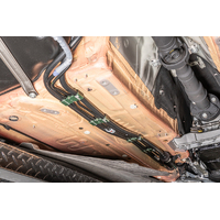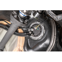 The feed and/or return hose can be easily modified for installation of an in-line flex fuel sensor. Furthermore, the hoses run though billet aluminum fuel line retainers. A special retainer is provided to prevent the lines from contacting the driveshaft and exhaust when crossing over the tunnel.