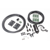 These plumbing kits include everything required to plumb the fuel system between the Radium fuel pump hanger to a port injection fuel rail. A -8AN 90 degree PuskLok hose end is included for connecting to an -8AN male port injection fuel rail fitting (not included). A -6AN 90 degree PuskLok hose end is included for connecting to an -6AN male aftermarket FPR fitting (not included). A -6AN (3/8") fuel hose runs to the fuel pump hanger return port.