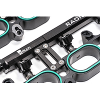 The fuel rails are CNC machined from extruded 6063 aluminum with a large 0.69in (17.5mm) bore. They are anodized for oxidation protection and laser etched for a high quality surface finish. Both end ports of each fuel rail are machined with 8AN ORB (3/4-16 female) threads.
